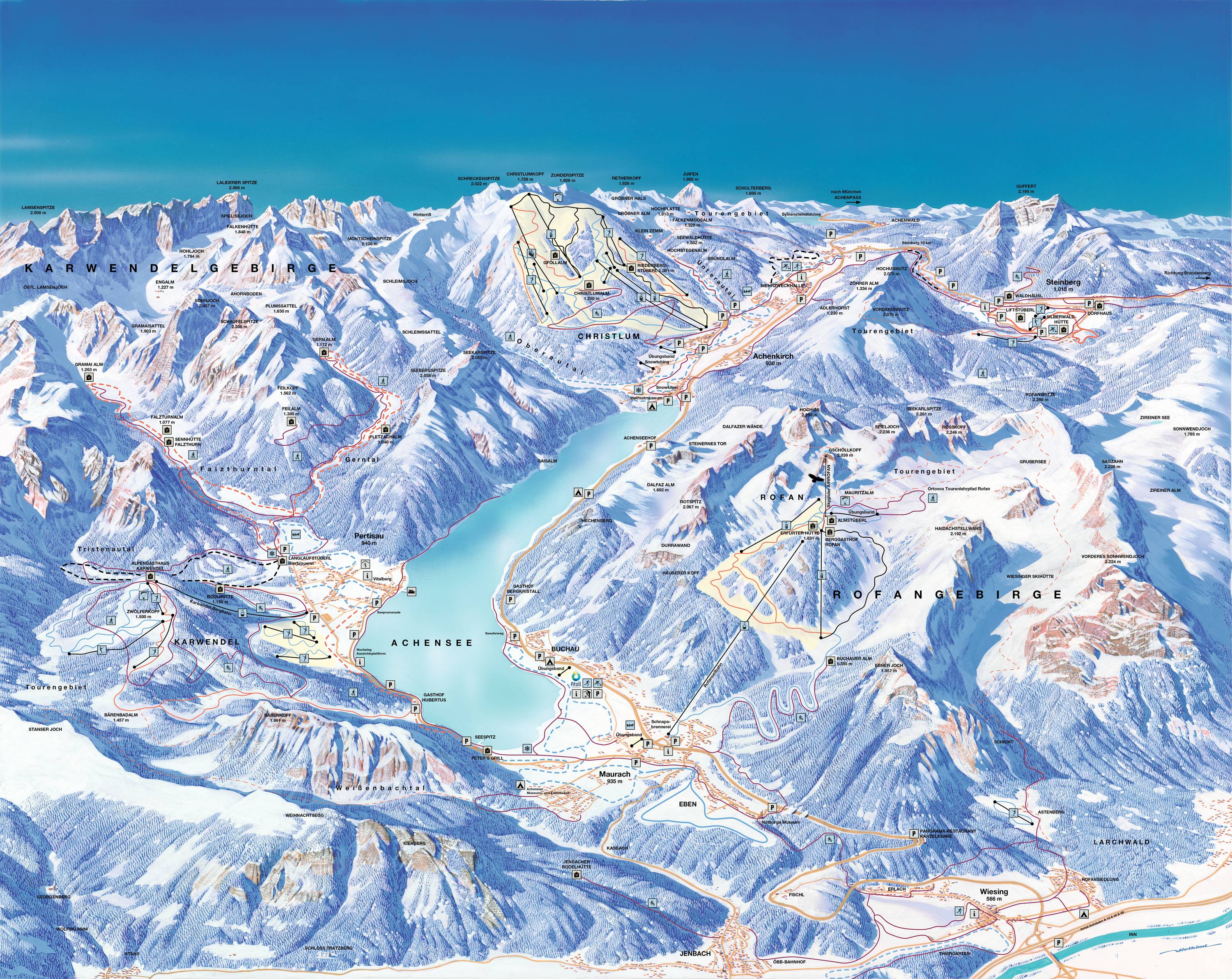 Aan de Achensee hebben de volgende 5 skigebieden een pistekaart of panoramakaart.