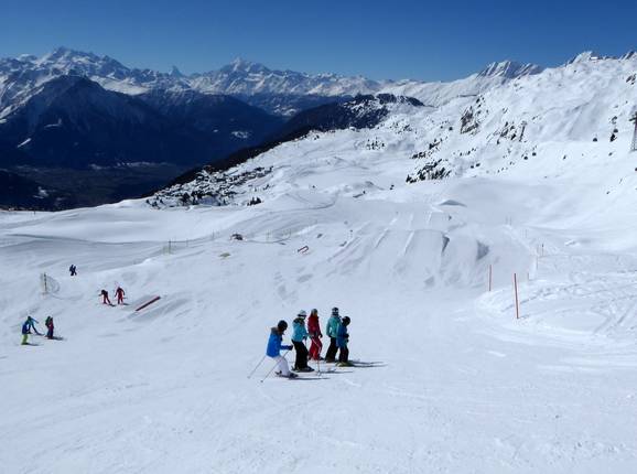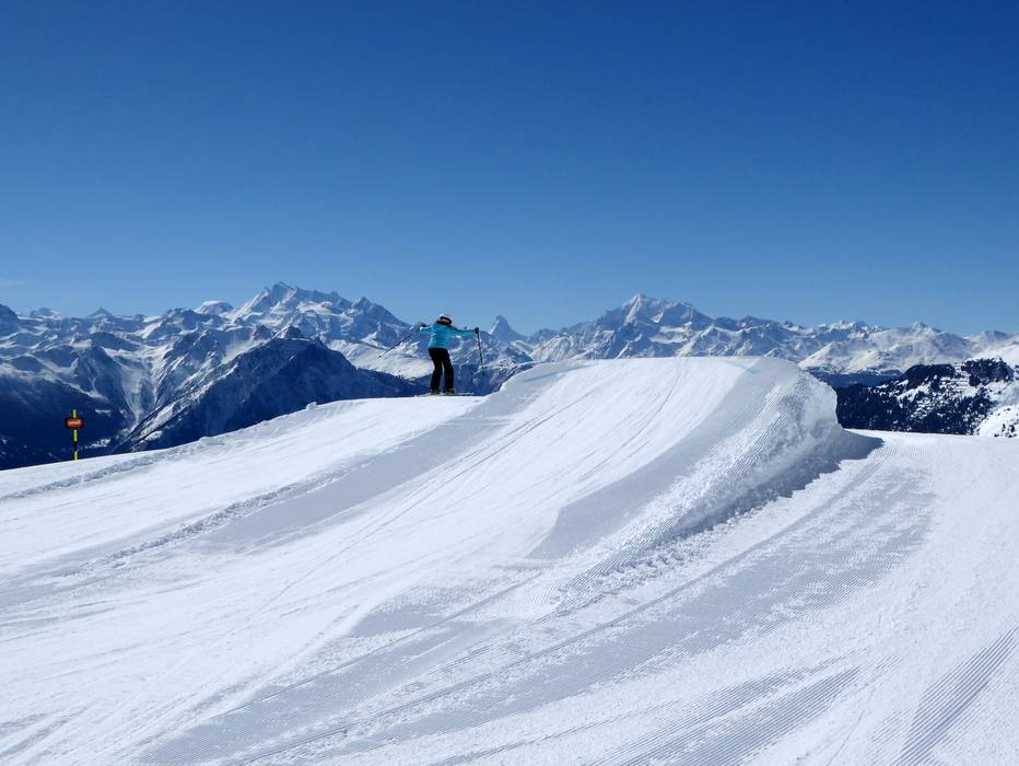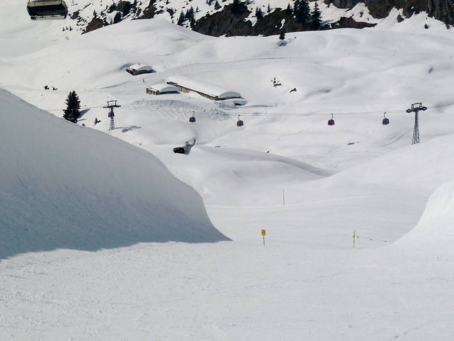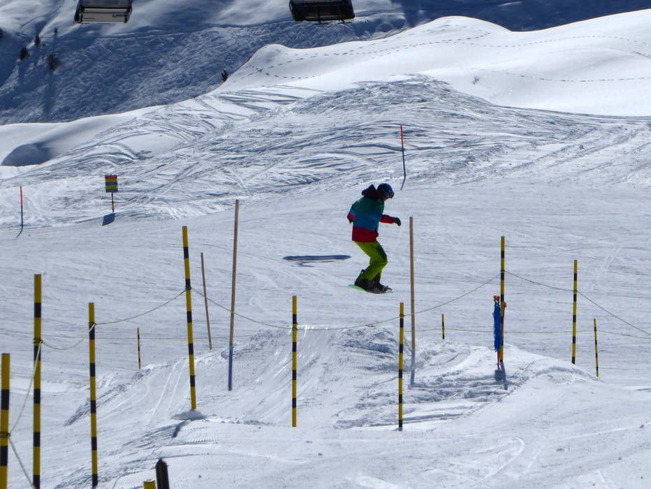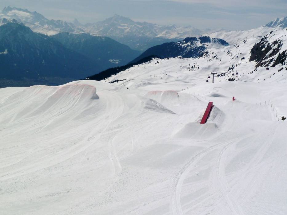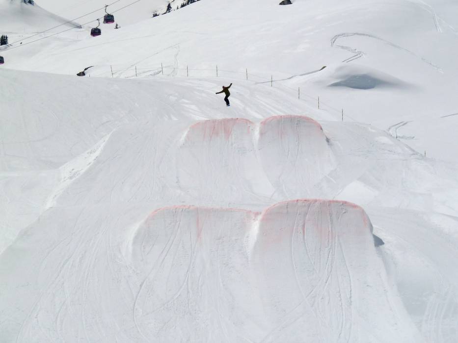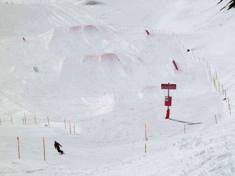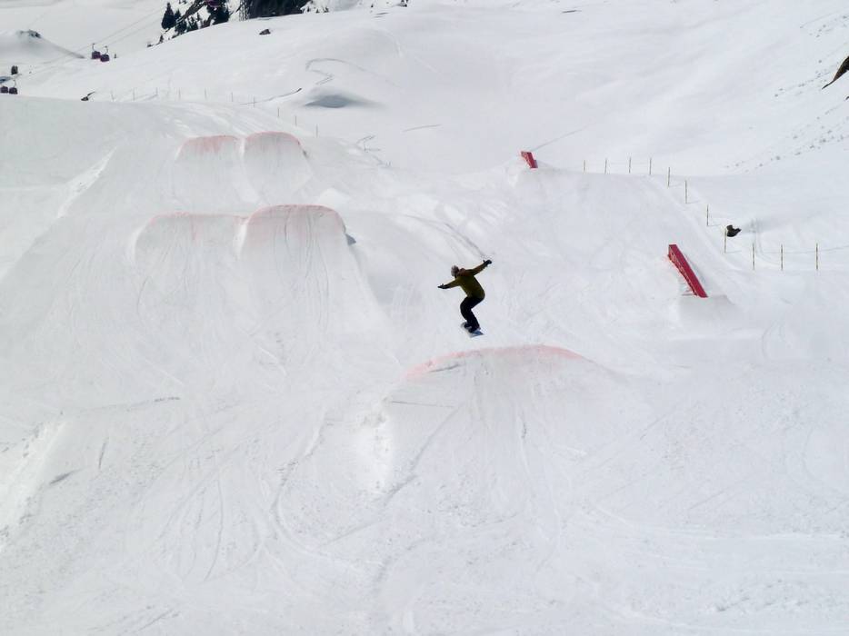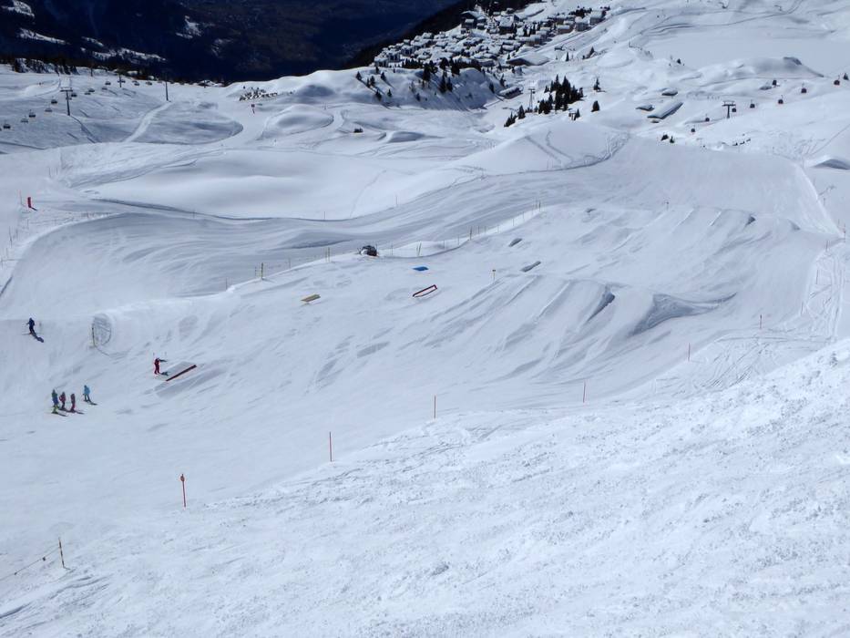 Kleine snowpark op de Fiescheralp met kleine jumps en obstakels.