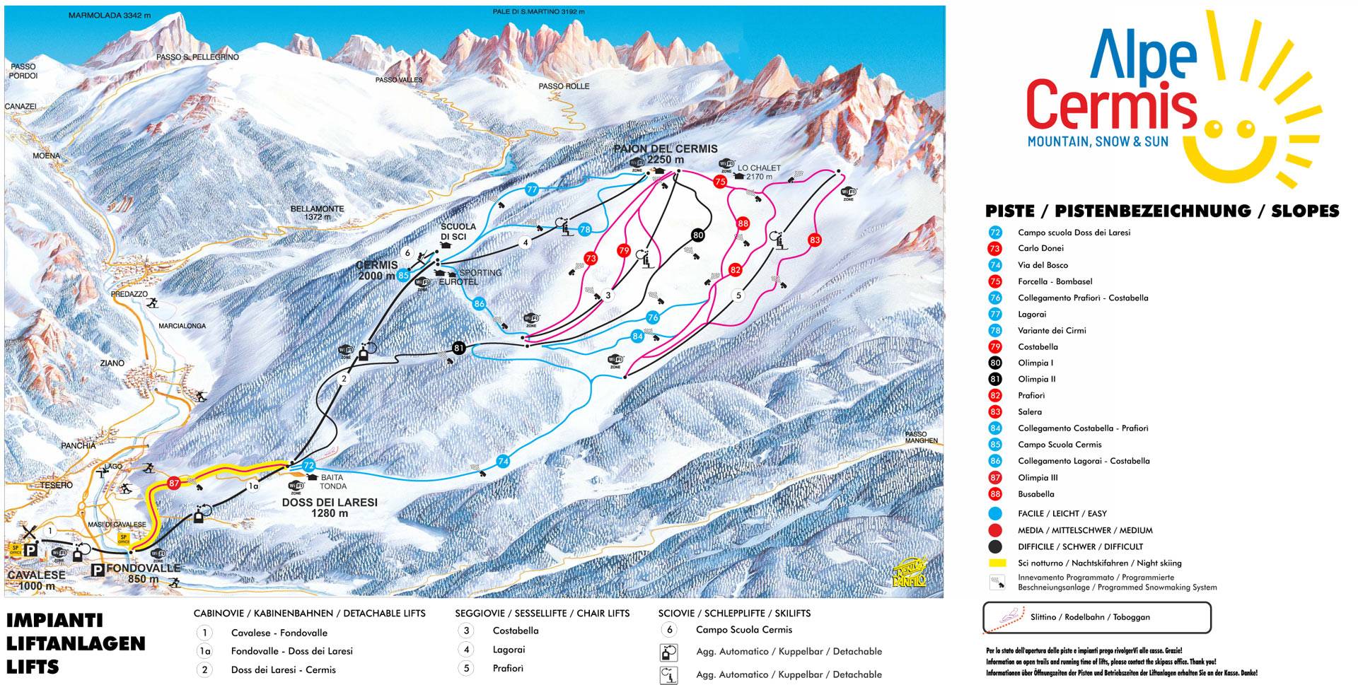 Het pisteplan is drietalig (Italiaans, Duits en Engels) en geeft het volledige skigebied Alpe Cermis duidelijk weer. Alle liften en pistes zijn ingetekend en beschreven. Daarnaast vind je op het pisteplan ook de andere skigebieden in Val di Fiemme (Fleimstal). Op de achterkant staan de vernieuwingen en gedragsregels eveneens in meerdere talen vermeld.