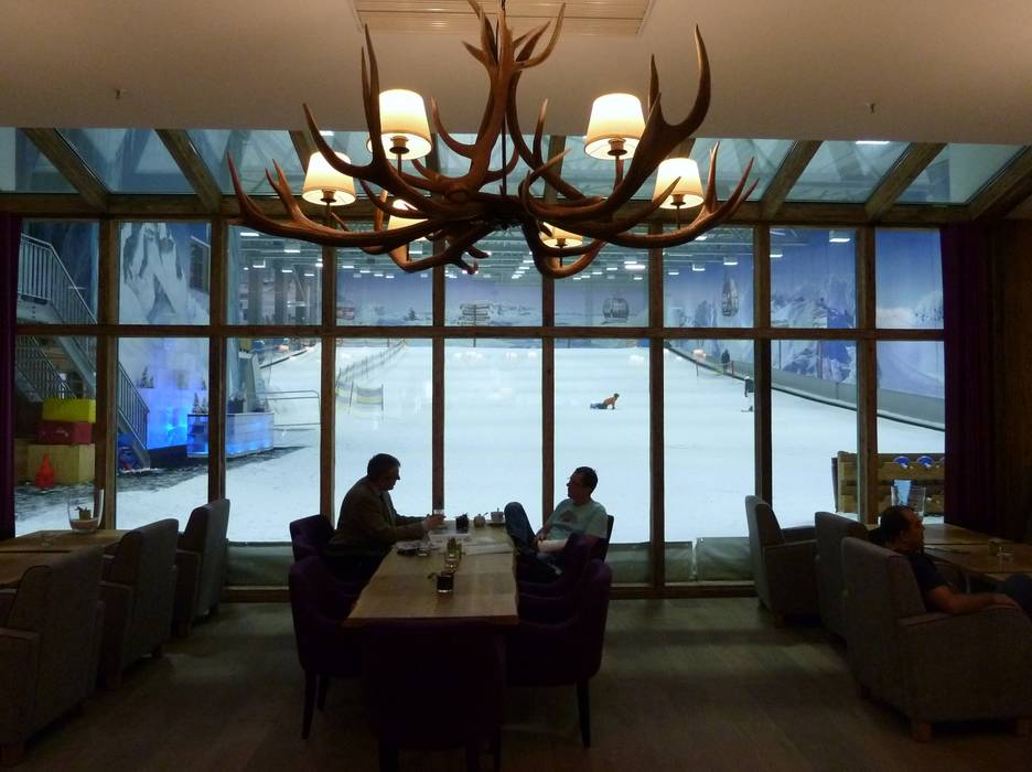 Aan de voet van de skihal op de eerste verdieping met uitzicht op de pistes