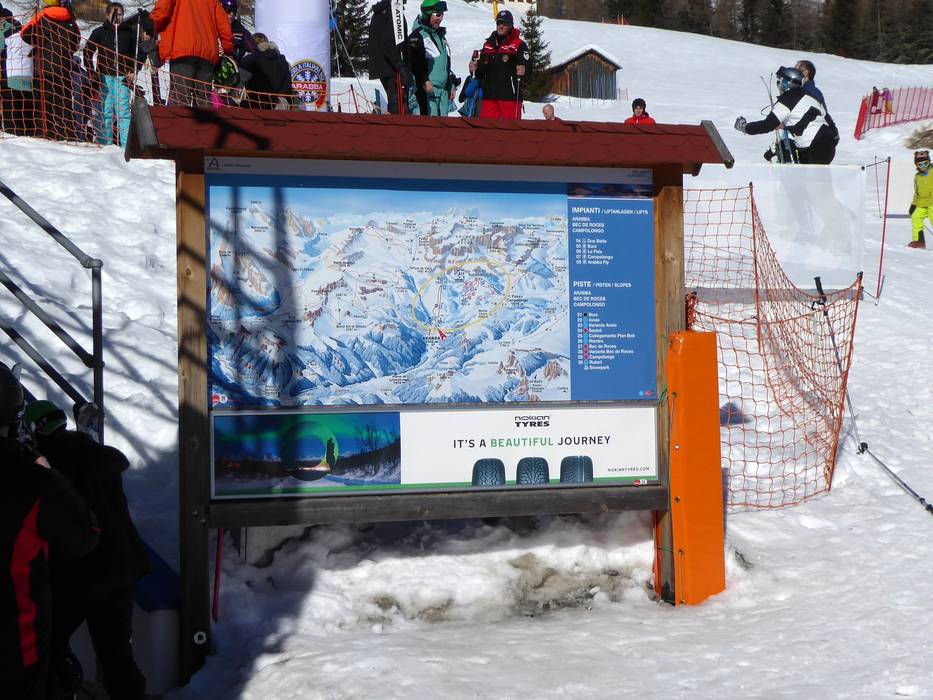 De bewegwijzering op de pistes is over het algemeen zeer goed. De weergave van de Sellaronda (ronde om het Sellamassief) is ideaal. De twee kleuren groen en oranje geven heel duidelijk de verschillende richtingen rond het Sellamassief aan. Op sommige plaatsen zouden informatieborden kunnen worden toegevoegd.