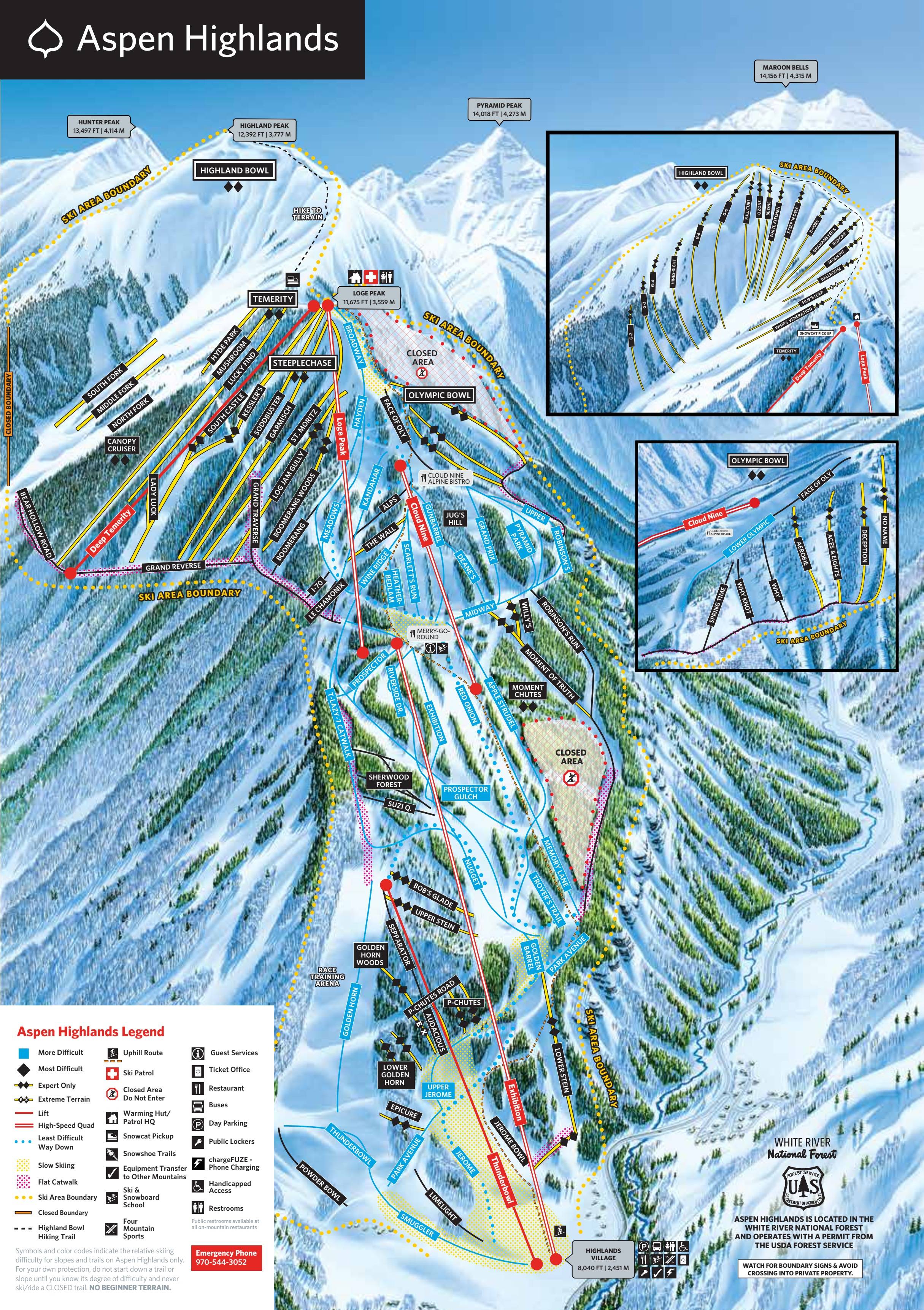 Het pisteplan omvat alle vier skigebieden van Aspen Snowmass. Alle pistes en liften zijn ingetekend. Daarnaast vindt u extra informatie over elk skigebied. De hoogtepunten van de vier skigebieden van Aspen worden ook op het pisteplan beschreven.