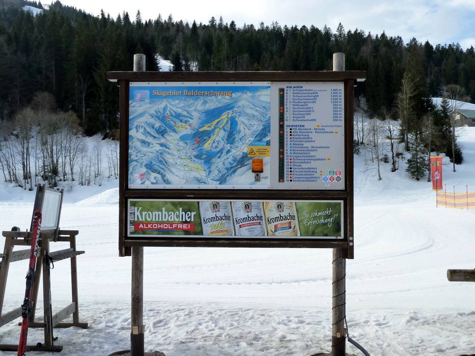 Het pisteplan geeft het skigebied Balderschwang met de Riedberger Horn en de Schelpen goed weer. Alle pistes en liften zijn met informatie aangegeven. Horecagelegenheden, parkeerplaatsen, loipes en de hoogtegegevens zijn ook vermeld.