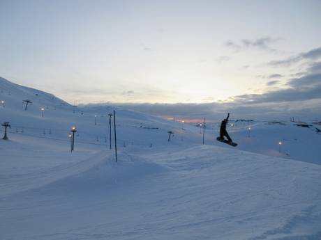 Het skigebied Bláfjöll biedt een klein snowpark voor freestylers.