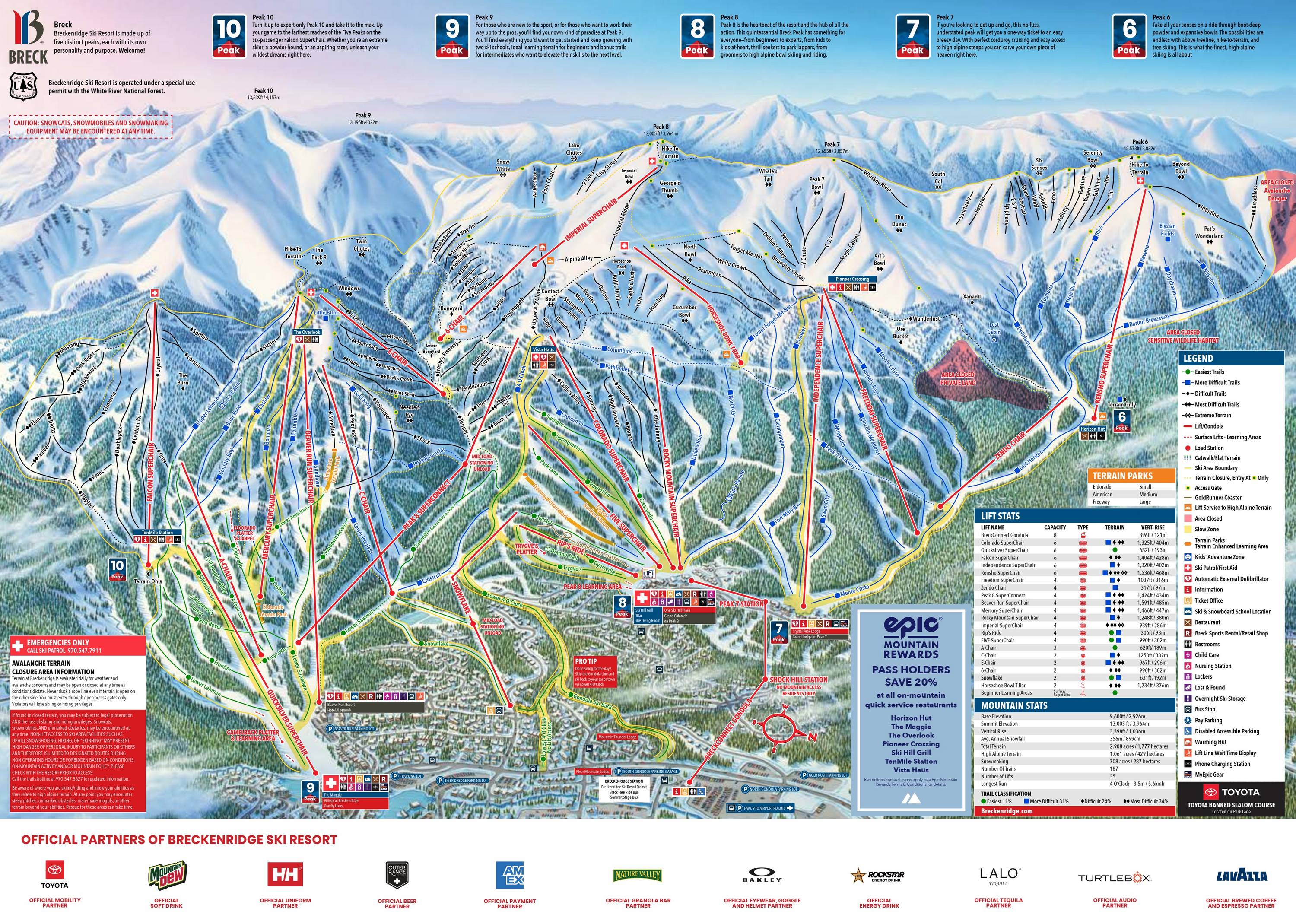 Het pisteplan geeft het hele skigebied zeer goed weer. Op de achterkant vind je een detailkaart van de Peak 9 North Slopes. Alle liften en pistes zijn met gedetailleerde informatie aangegeven. Je vindt extra informatie over de skischool, activiteiten, restaurants, parkeerplaatsen en alle belangrijke telefoonnummers op het pisteplan. Alle bergen zijn voorzien van hoogteaanduidingen. Extra hoogteaanduidingen bij de bergstations van de liften zouden nog nuttig zijn.