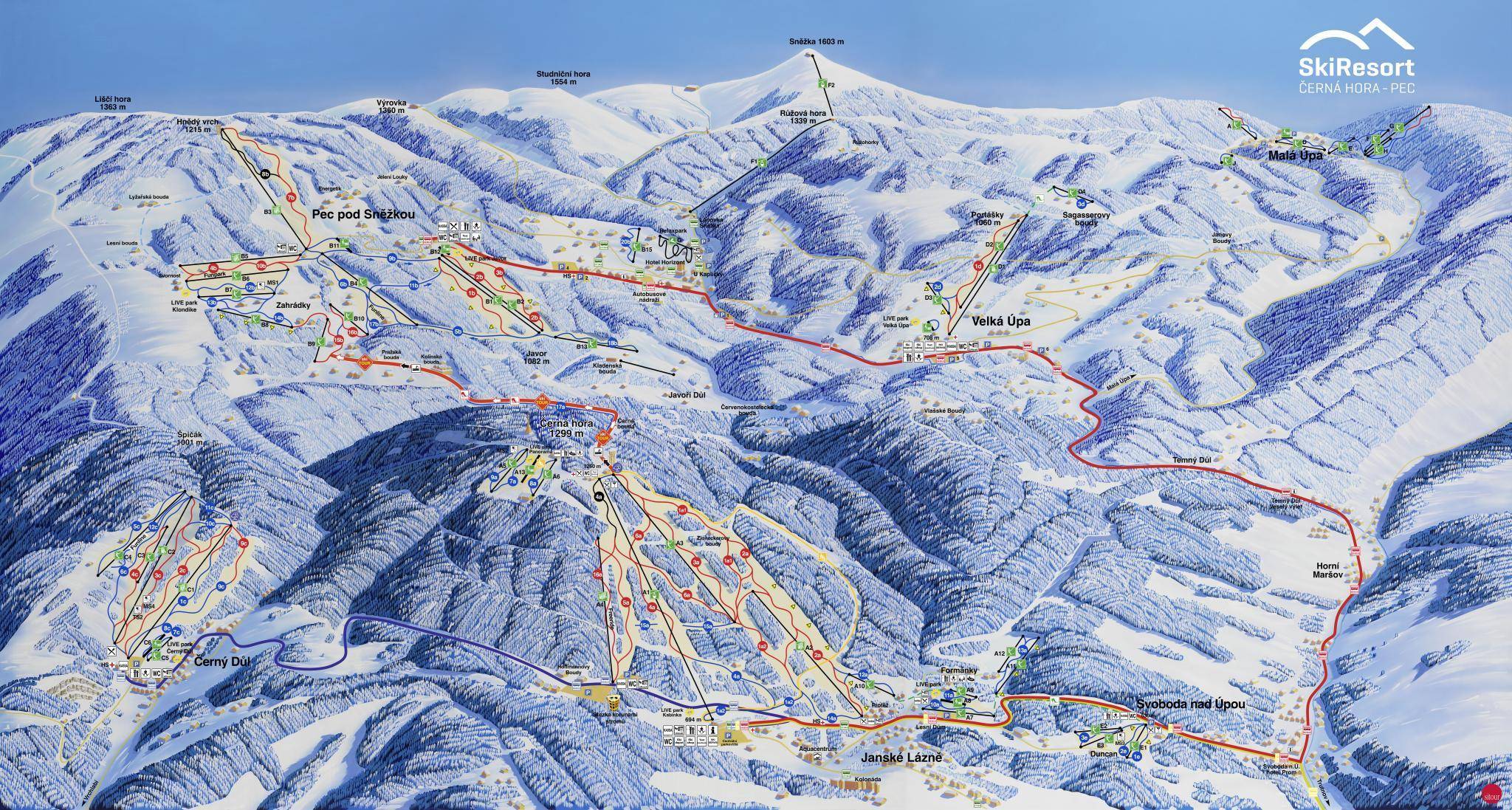 Pistekaart Černá hora/Pec pod Sněžkou/Černý Důl/Velká Úpa/Svoboda nad Úpou/Malá Úpa seizoen 2025/2026
