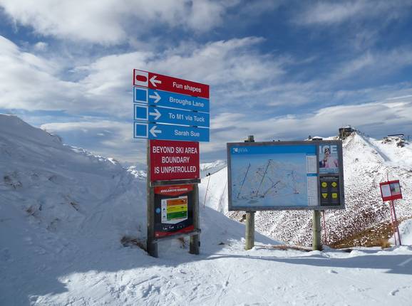 Oriëntatie (pistekaart, informatieborden, bewegwijzering piste) en veiligheid in het skigebied Coronet Peak