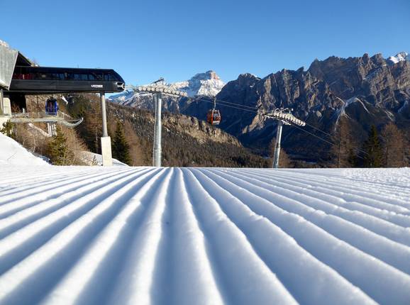 In het skigebied Cortina d'Ampezzo worden de pistes elke nacht optimaal geprepareerd. De pistes verkeren daardoor in een perfecte staat.