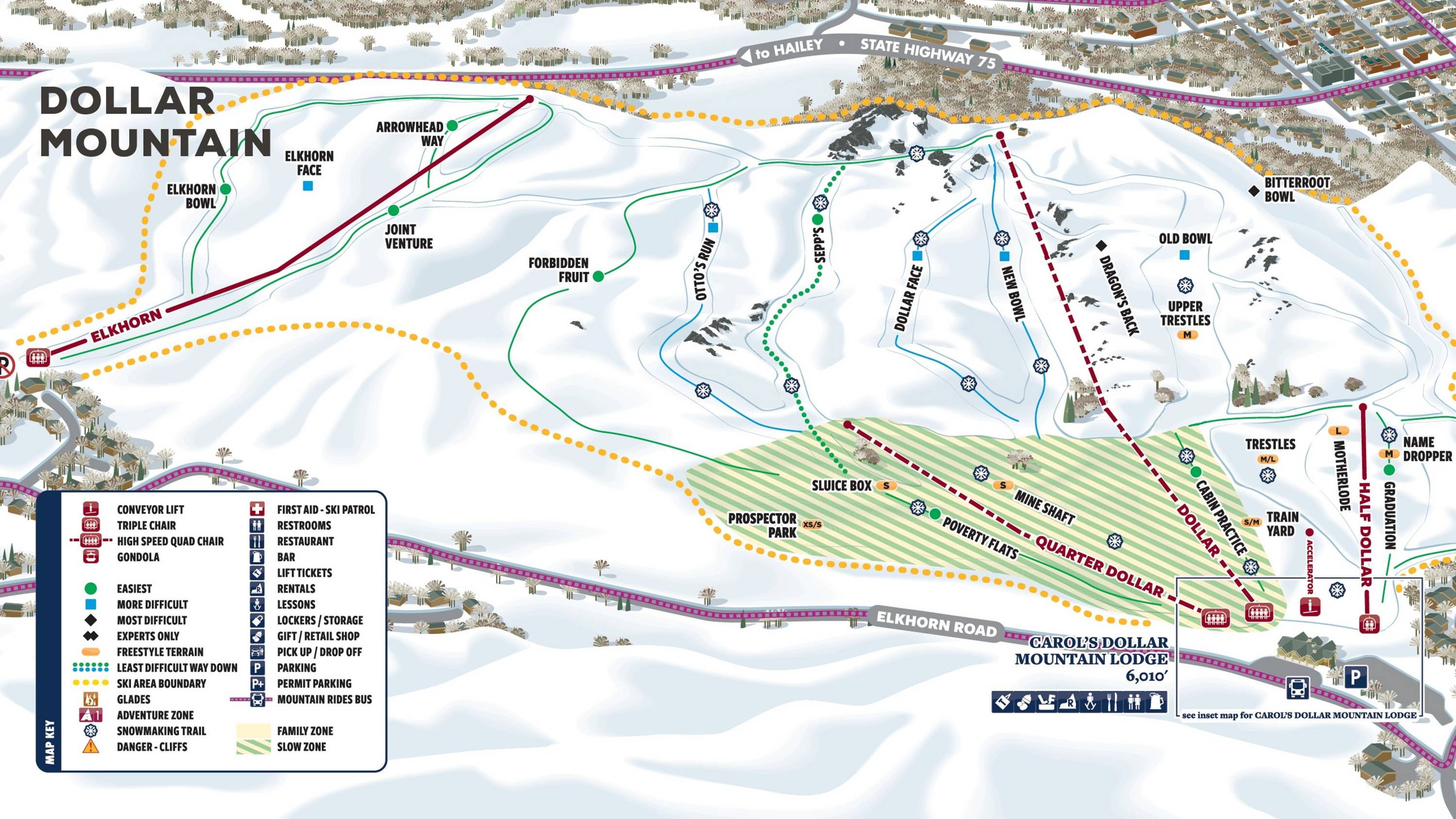 Het pisteplan geeft het skigebied Dollar Mountain goed weer. Alle pistes en liften zijn ingetekend. Op de achterkant staat het plan van het skigebied Bald Mountain. Verdere informatie over horecagelegenheden, skischool, skiverhuur, freestyle-terrein zones en loipes is ook aanwezig. De Sun Valley App biedt bovendien realtime informatie over de skibedrijf.