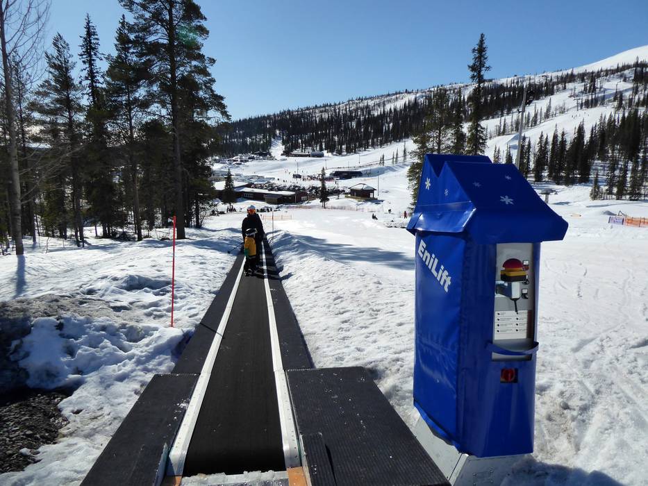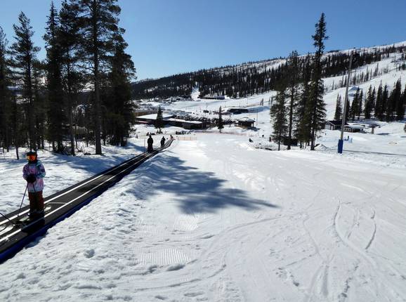 Direct naast het dalstation is er een afgebakend gebied met een transportband. Hier kunnen de kleintjes in alle rust hun eerste bochten oefenen of een ritje op de slee maken.