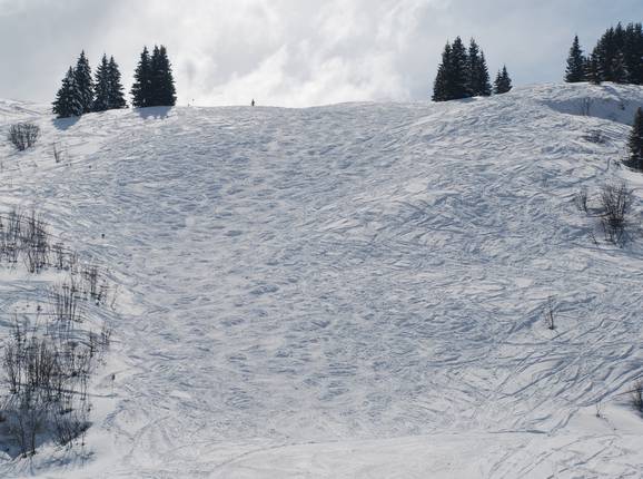 Aan de noordhelling van de Mont Rond leidt deze niet altijd geprepareerde zwarte piste door het bos naar het dal. Dankzij de afkoppelbare zespersoonslift ben je snel weer boven. - Sapinière · Lengte 0,7 km · Hoogteverschil 200 m
