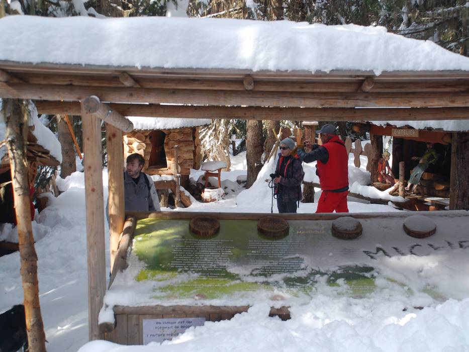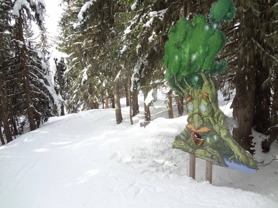 Mooi vormgegeven puzzelparcours door het bos boven Les Saisies, dat kinderen met ski's of sneeuwschoenen kunnen verkennen.