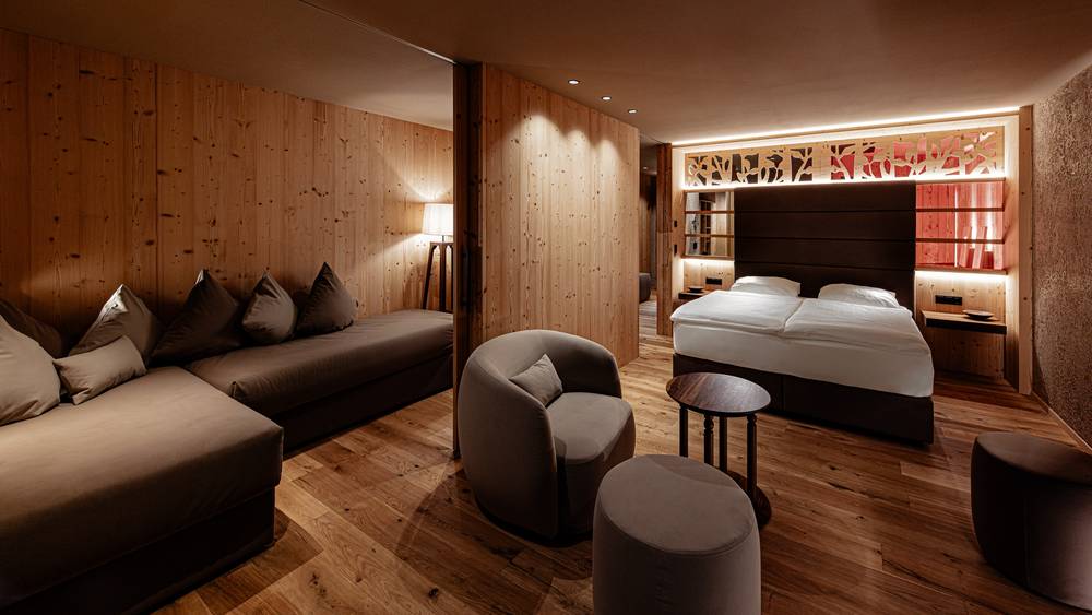 De alpine kamers en suites zijn uitgerust met veel hout en alle denkbare luxe. Ze zijn ingericht met lokale houtsoorten en stralen zowel traditionele hotelromantiek als klassiek-moderne vakantiesfeer uit. Hier blijft geen wens onvervuld.