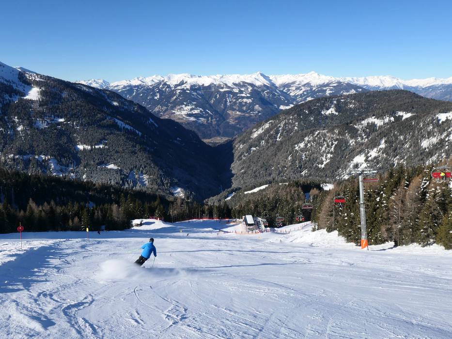 Vanaf het hoogste punt in het skigebied bij de top van de Goldeck, langs het bergstation van de Talbahn Goldeck en vervolgens via de zwarte skiroute tot aan het dalstation.