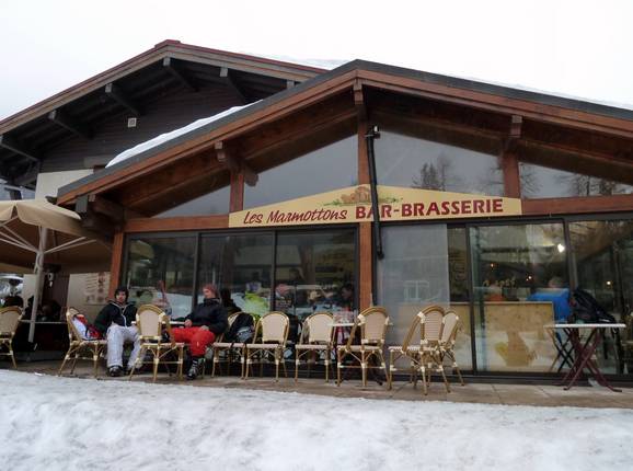 Qua après-ski is het relatief rustig in het skigebied van Les Grands Montets. Bij het dalstation zit men nog gezellig samen met een biertje of een glas wijn.