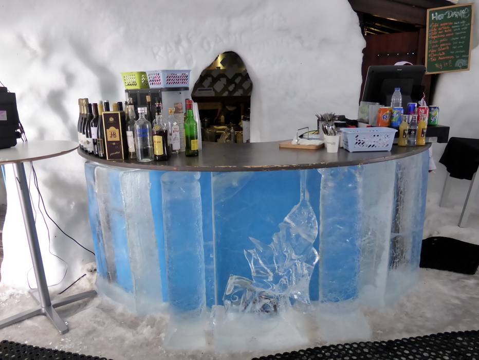 Het hotel is 100% uit sneeuw gebouwd en heeft een bar voor de après-ski.