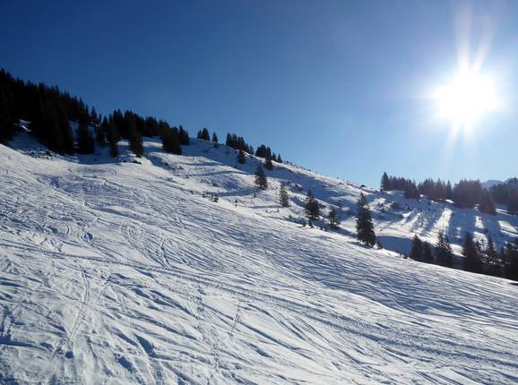 Er zijn weliswaar geen moeilijke pistes in het skigebied Grasgehren, maar de freeridehellingen bij de Bolgengrat en de Riedbergerhorn mogen er zijn.