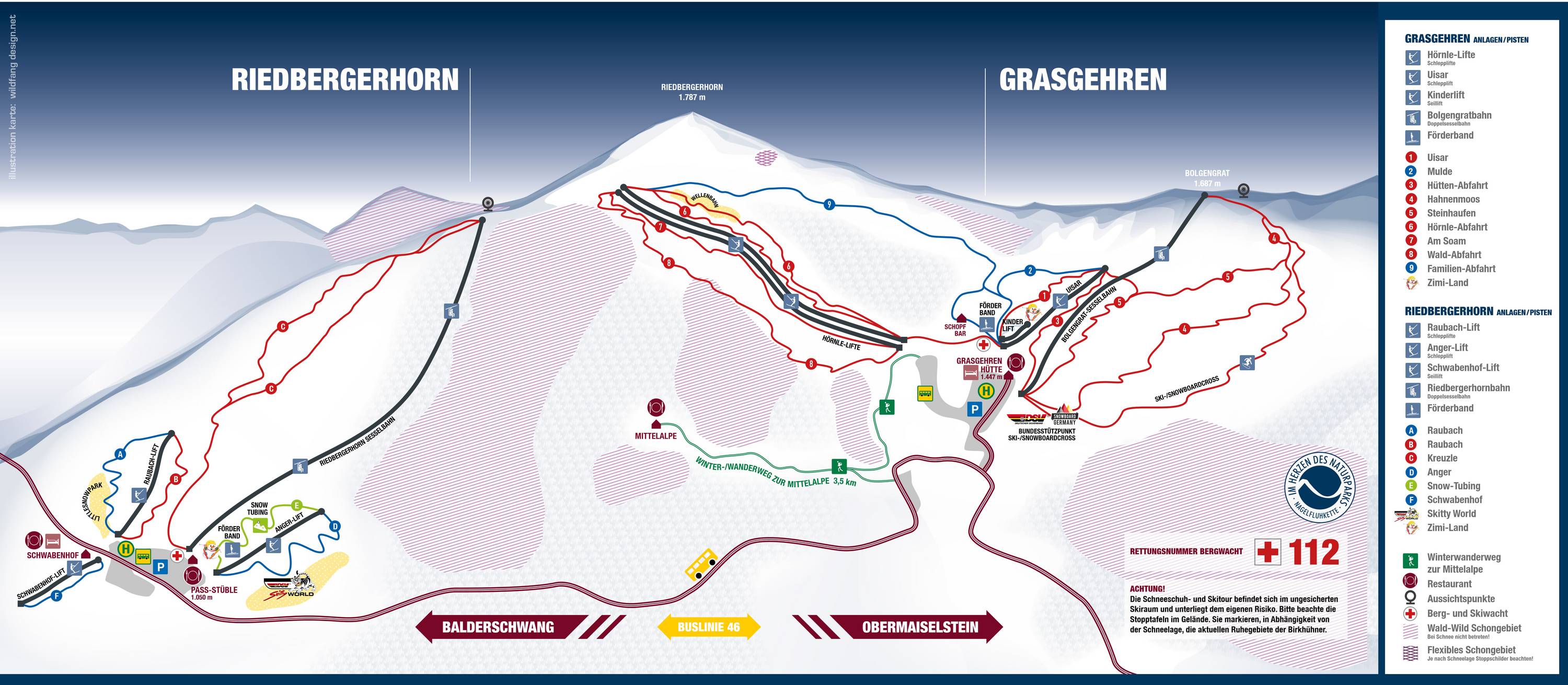 Oriëntatie (pistekaart, informatieborden, bewegwijzering piste) en veiligheid in het skigebied Grasgehren – Bolgengrat