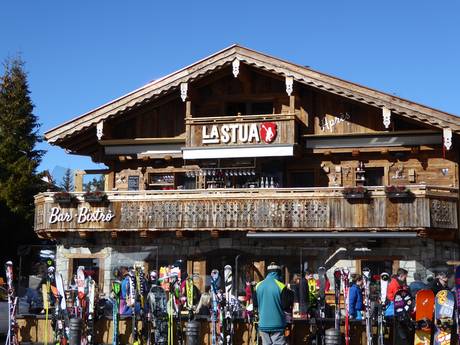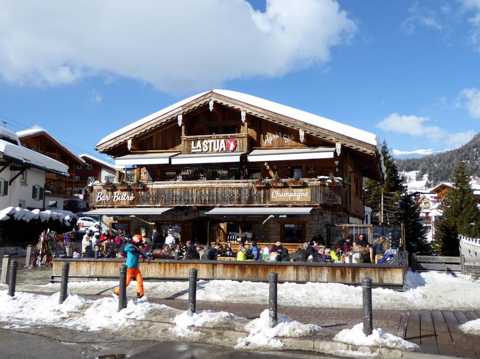 De bar La Stua bevindt zich direct aan het einde van de piste en heeft daarmee de ideale locatie in het centrum van Wolkenstein. Perfect om de skidag af te sluiten. In het weekend is het hier altijd gezellig druk.