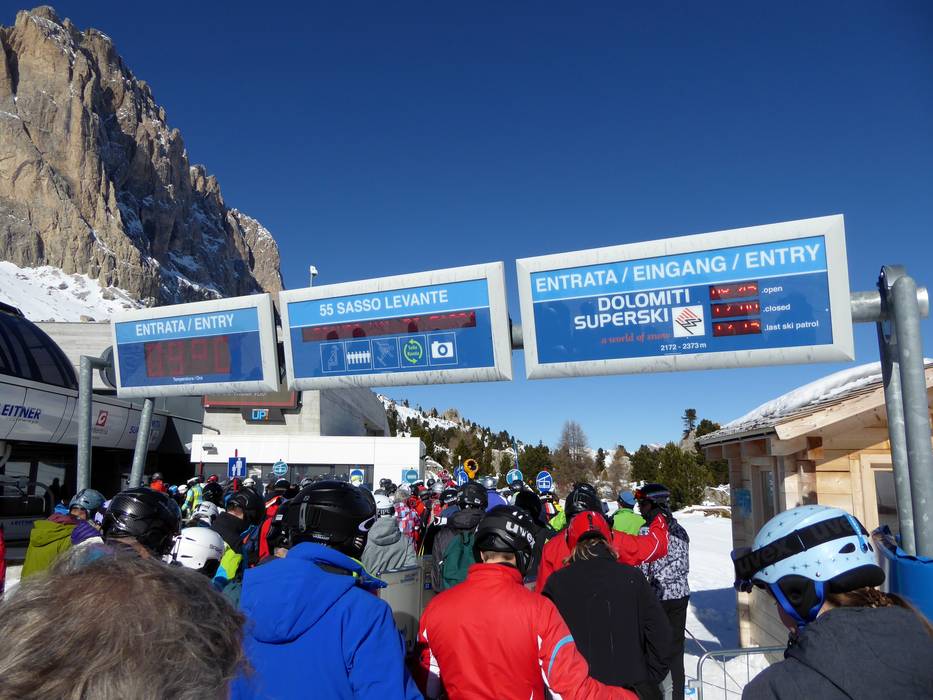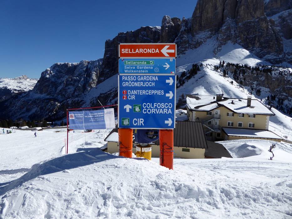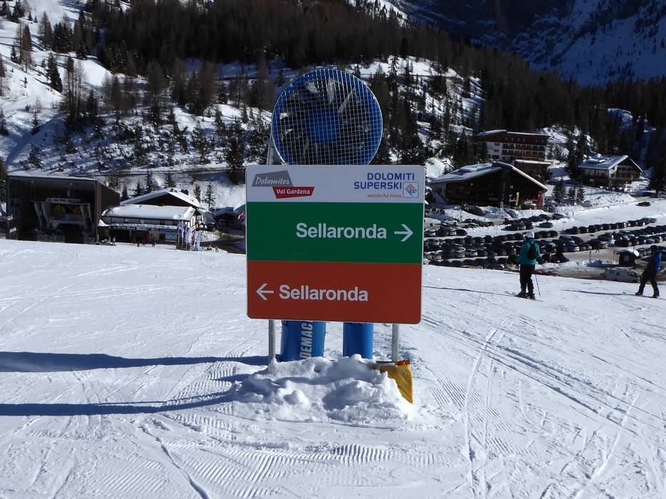 Ideaal is de weergave van de Sellaronda (ronde om het Sellamassief). De twee kleuren groen en oranje geven heel duidelijk de verschillende richtingen rond het Sellamassief aan. Op sommige plaatsen zouden echter uitgebreide informatieborden kunnen worden toegevoegd en meer actuele bedrijfsinformatie beschikbaar kunnen zijn.