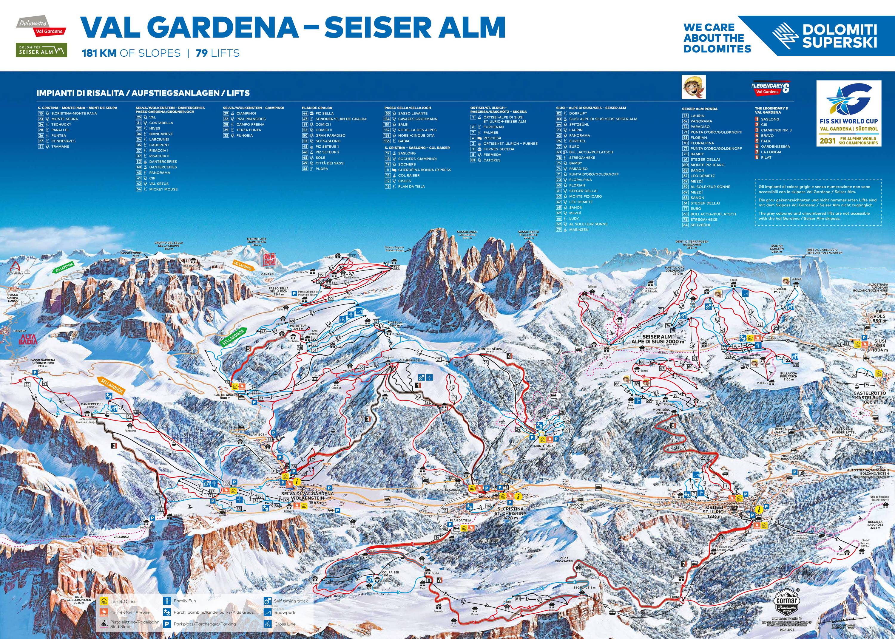 Op het pisteplan van Gröden is het verloop van de pistes zeer goed te zien en het bevat veel hoogteaanduidingen. Zeer positief is dat wordt aangegeven of stoeltjesliften afkoppelbaar zijn (hogesnelheidsliften). Snowparks en kinderparken zijn gemakkelijk te vinden. Daarnaast is er een weergave van de Sellaronda en de aangesloten skigebieden. Helaas zijn de namen van de pistes en de hutten niet op de kaart te herkennen.