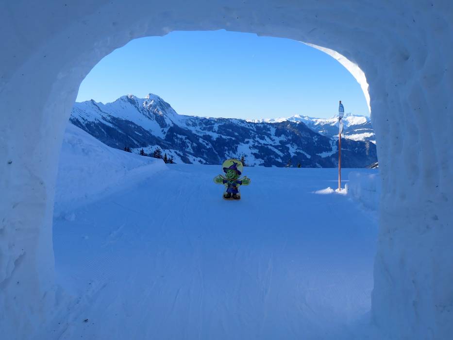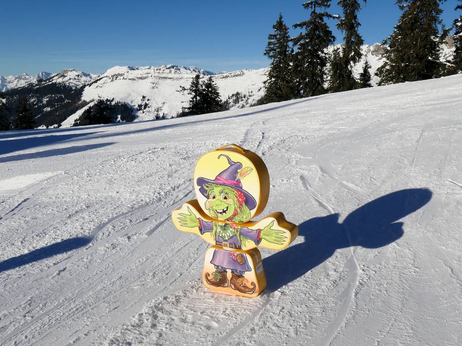 De sneeuwtunnel met heksenfiguren ligt bij de familieafdaling Kristall.