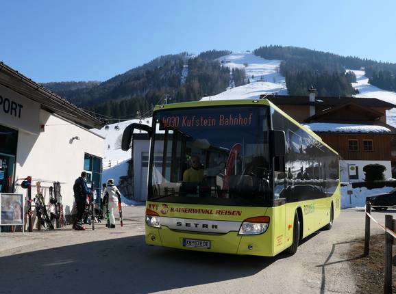 - Er rijdt een skibus van Kufstein tot aan de bergbaan (Kufstein Bahnhof – Kufstein – Ebbs – Niederndorf – Walchsee – Kössen – Kössen Unterberghornbahn). Met een skipas is de bus gratis.