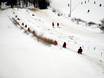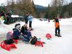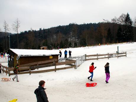 Voor families is er bijna 14% korting, maar alleen op het dagticket. De skischool geeft pas les aan kinderen vanaf zes jaar en het kleine oefengebied heeft geen lift, maar is in ieder geval schaars versierd. Positief zijn de extreem korte afstanden: skiverhuur, skischoolkantoor, toiletten, kassa – alles is hier echt op één plek. Ook de overzichtelijkheid van het skigebied wordt door families gewaardeerd; niemand raakt hier de weg kwijt. Wie nog niet kan of wil skiën, vindt met de rodelbanen een alternatief. Er is geen kinderopvang, maar wel een verschoonruimte.
