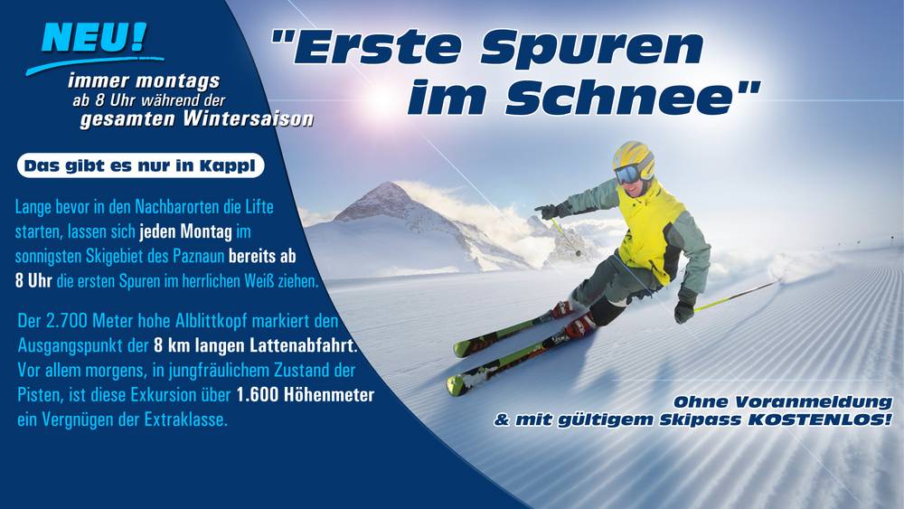 Elke maandag gedurende het hele winterseizoen: Eerste sporen in de sneeuwDat kan alleen in Kappl: Lang voordat in de naastgelegen dorpen de liften opengaan, kunnen er in het zonnigste skigebied van Paznaun al de eerste sporen in de heerlijk witte sneeuw worden getrokken. Elke maandag gaan de Dia-, Alblitt- en Alblittkopflift met dit doel al om 8.00 uur open. Een ervaren gids van de Skischule Kappl Aktiv begeleidt de wintersporters die maar niet genoeg kunnen krijgen van de witte pracht