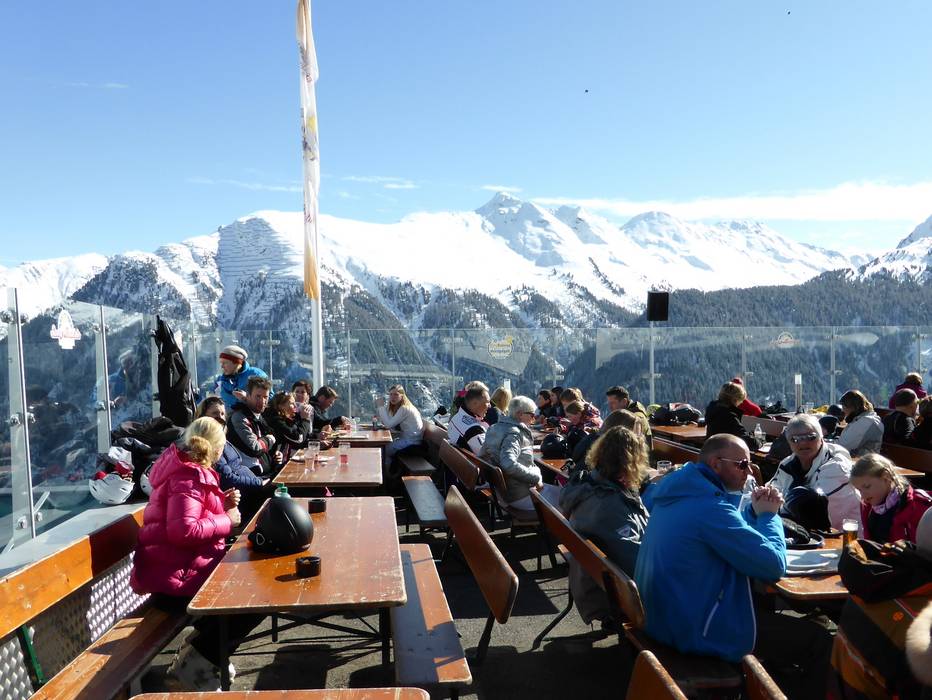 Er worden kleine Tiroler lekkernijen aangeboden. De panoramabar biedt een prachtig uitzicht op de omliggende bergen.
