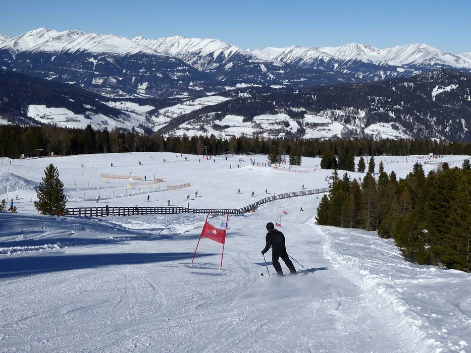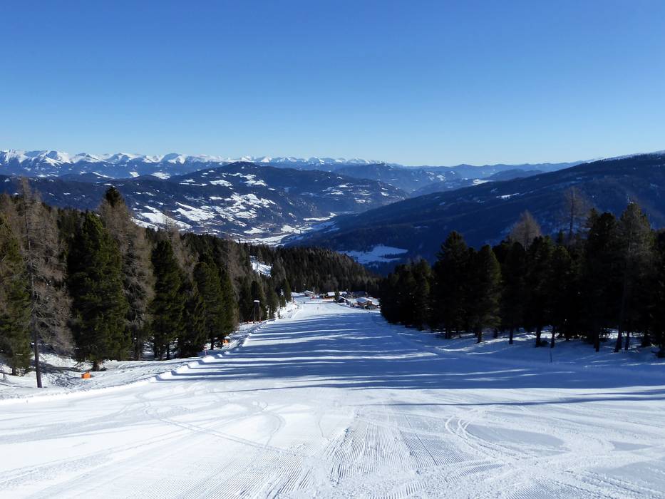De middelzware piste 9 loopt in het bovenste gedeelte boven de boomgrens en biedt een prachtig uitzicht op het omliggende landschap. In het onderste deel slingert de piste zich door het voor het skigebied kenmerkende dennenbos. - Piste 5