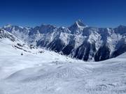 Veel vrije skiruimte, gevarieerde en sneeuwzekere pistes, panoramisch uitzicht op het Walliser berglandschap, zonnig skigebied, gondelbaan tot 3111 mMinpunten: