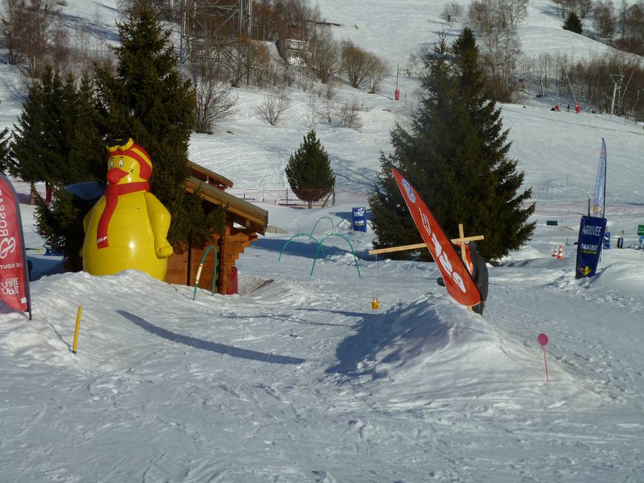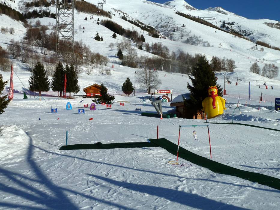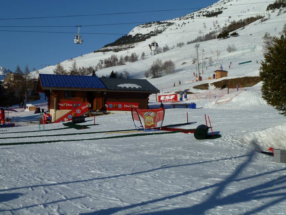 Het tweede kinderland van de ESF Les Deux Alpes is iets kleiner en ligt direct naast het hoofdgebouw in het centrum - hier leren kinderen spelenderwijs met het materiaal van de Franse Piou-Piou-kinderlanden.