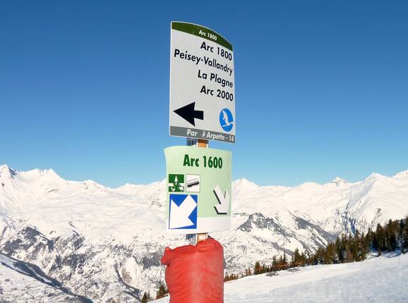 Vooral aan de noordwestelijke helling van het gebied is het soms lastig om je te oriënteren tussen de talrijke parallel lopende afdalingen naar de verschillende dorpen aan de voet van Les Arcs. Een voorbeeldig bewegwijzeringssysteem biedt uitkomst: alle kruispunten en splitsingen zijn uniform aangegeven met de naam en moeilijkheidsgraad van de afdaling en de liften en dorpen die je via deze route kunt bereiken. De borden zijn overzichtelijk vormgegeven en nauwelijks te missen. Op de piste-afbakeningspalen staat op regelmatige afstand de naam van de betreffende afdaling. Grote overzichtsborden zijn bovendien op alle knooppunten van het gebied geplaatst; bij de belangrijkste geven groene en rode lampen de openingsstatus van de liften en afdalingen aan.
