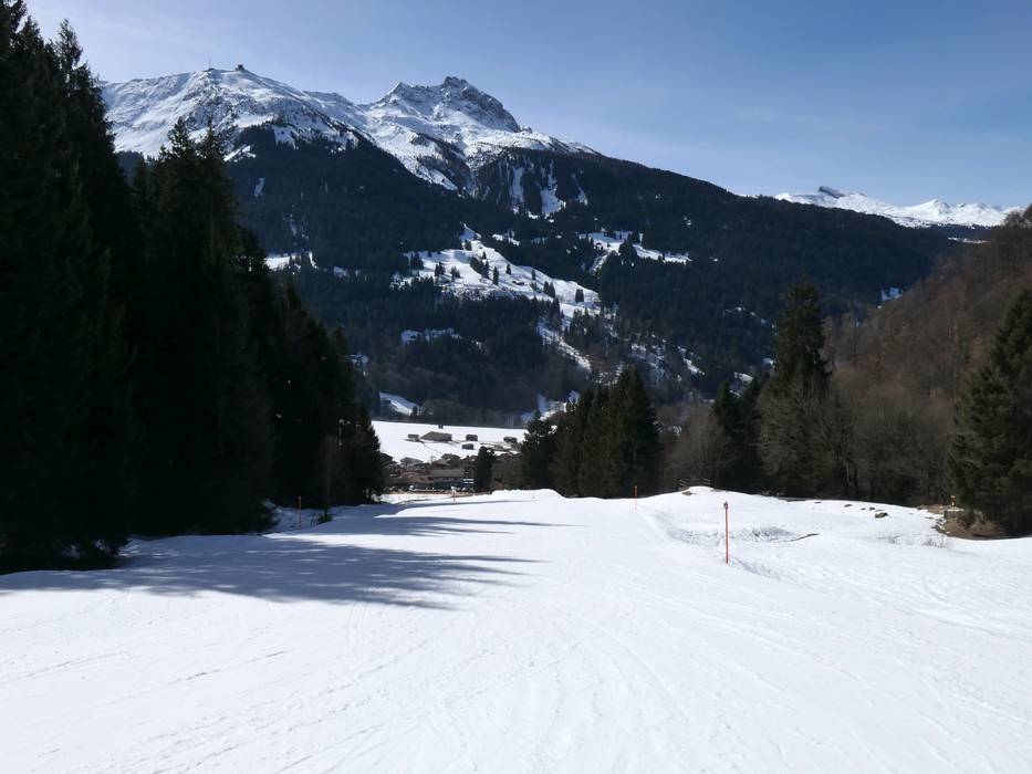 De dalafdaling is vanaf Schlappin tot aan het dalstation besneeuwd.