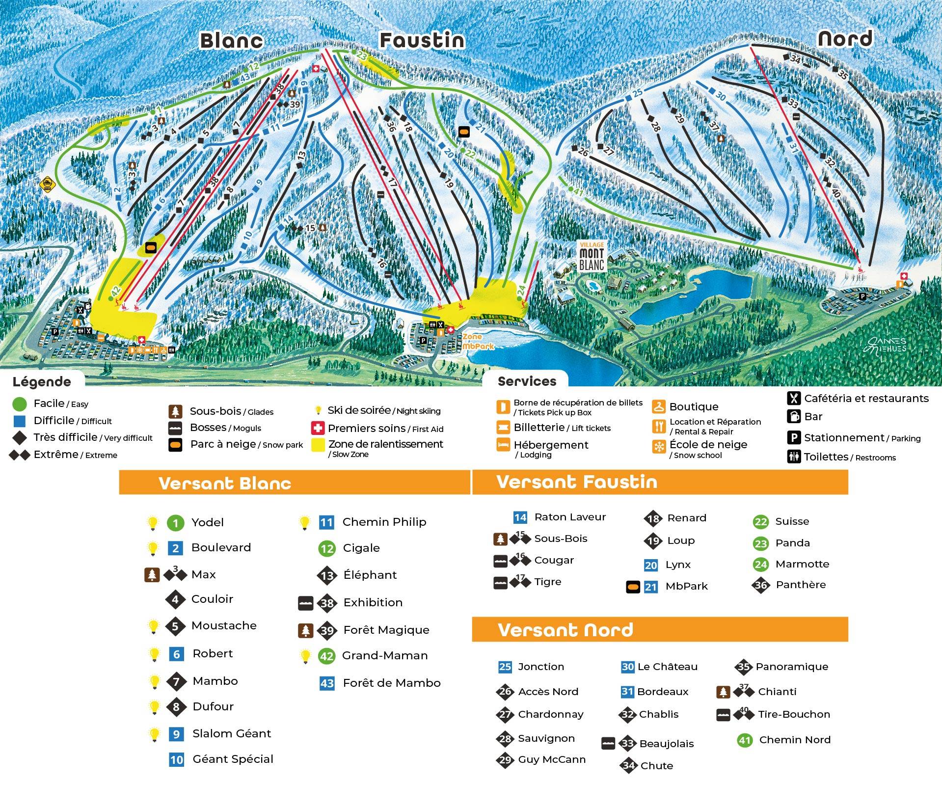 Het pisteplan geeft het skigebied Mont Blanc goed weer. Helaas ontbreken de hoogtegegevens en gedetailleerde informatie over de liften.