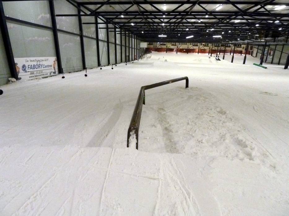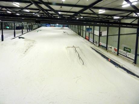 In de hele skihal vind je verspreid kickers, rails en boxen. Deze bevinden zich op de hoofdafdaling en zijn gemakkelijk te bereiken met de transportband of de sleeplift.