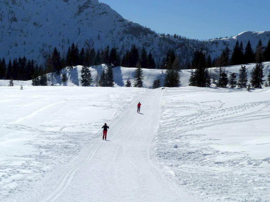 De sneeuwzekere loipe loopt door een bosrijk gebied bij de Tressdorfer Alm.