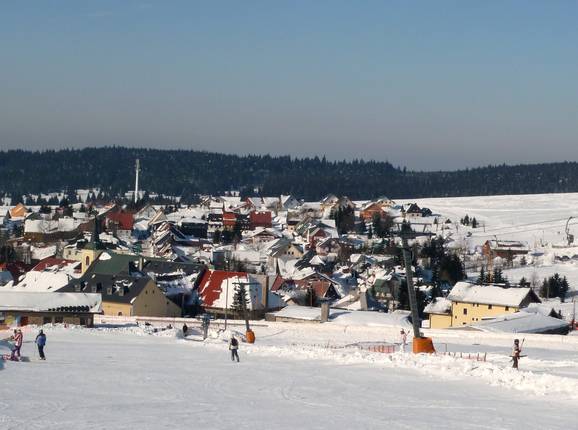Vanaf sommige accommodaties kun je vanuit het dorp Boží Dar bijna direct de pistes op. Over het algemeen moet je echter altijd een stukje door het dorp lopen om bij de pistes te komen.