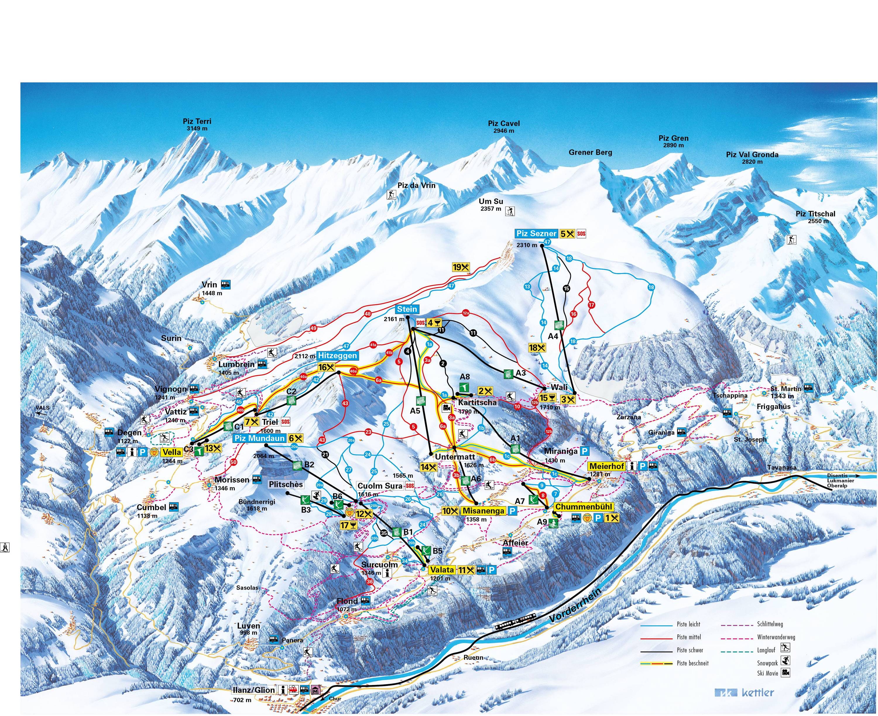 Het pisteplan geeft een zeer goed overzicht van het skigebied Obersaxen/Mundaun/Val Lumnezia. Alle liften, pistes, prijzen, enkele horecagelegenheden en verdere informatie zijn aangegeven. Meer informatie over de namen van de pistes en details over de liften zou nog wenselijk zijn.