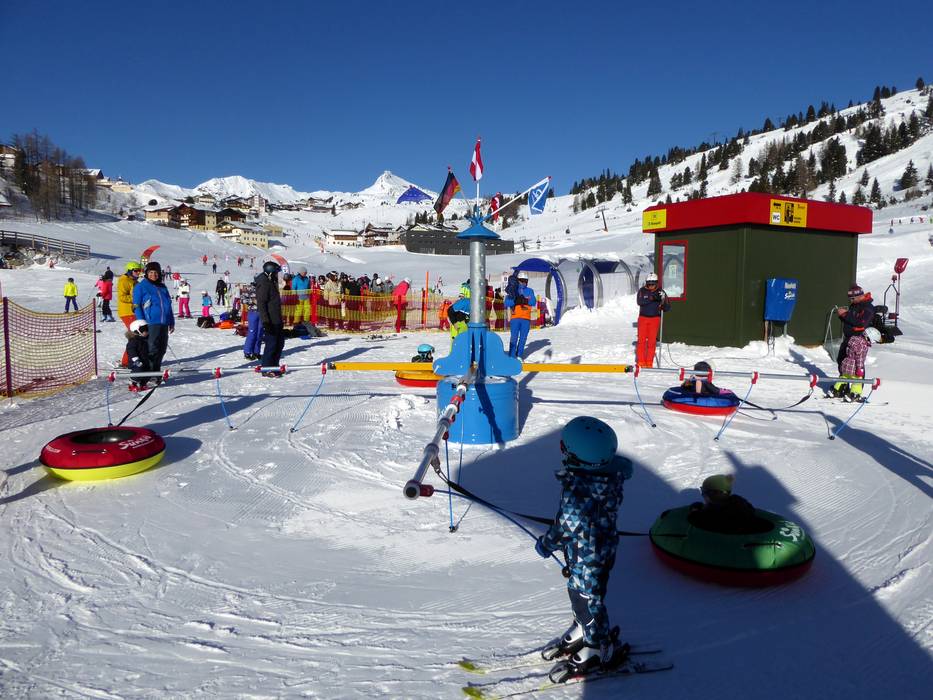 Niet ver van het toeristeninformatiepunt Obertauern bevindt zich het Kinderland van de TOP Skischule. Vrolijke figuren kijken toe terwijl de kinderen leren skiën op de transportband en de sleeplift.