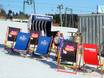 Wie hier blijft hangen, moet daarna een stukje omhoog lopen, want de Schirmbar staat midden op de piste, iets onder de bergstations. Bij zonnig weer worden er ligstoelen buiten gezet.