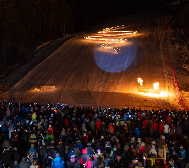 Ramsau am Dachstein verwelkomt zijn gasten met een sfeervol welkomstsneeuwfeest. 60 tot 100 deelnemers, grotendeels skileraressen en skileraren van de skischolen van Ramsau, zorgen voor een geweldige show en betoveren de gasten met acrobatische acts op de noordhelling van de Rittisberg.
