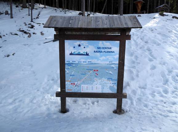 Het pisteplan geeft een schematische weergave van het skigebied Ravna Planina. Alle pistes en liften zijn ingetekend. Hoogtegegevens zouden nog nuttig zijn.