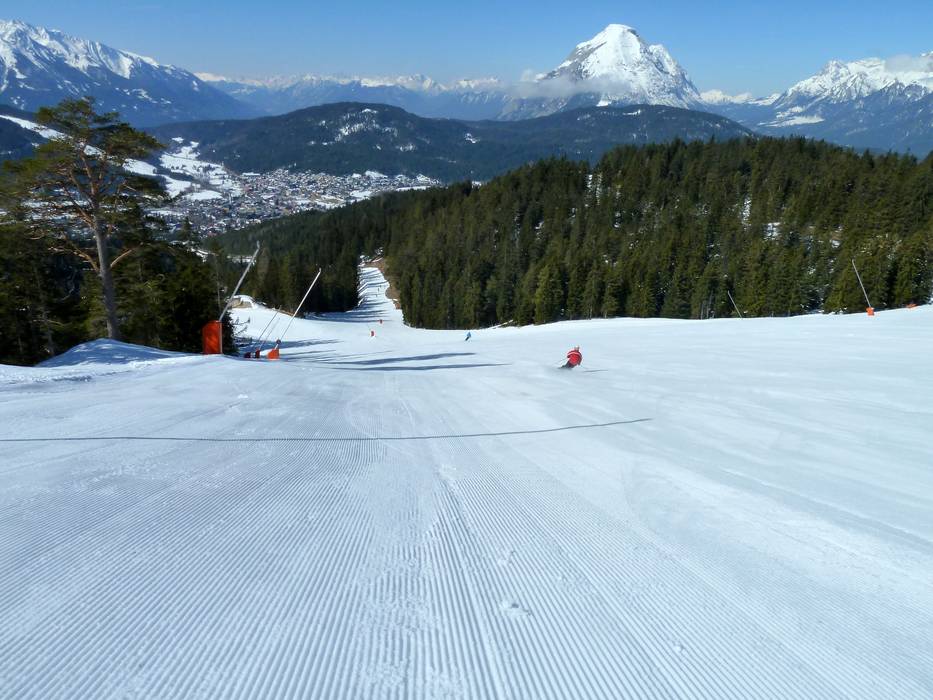 Vanaf de Seefelder Joch eerst de zwarte piste en daarna de gemakkelijke dalafdaling.
