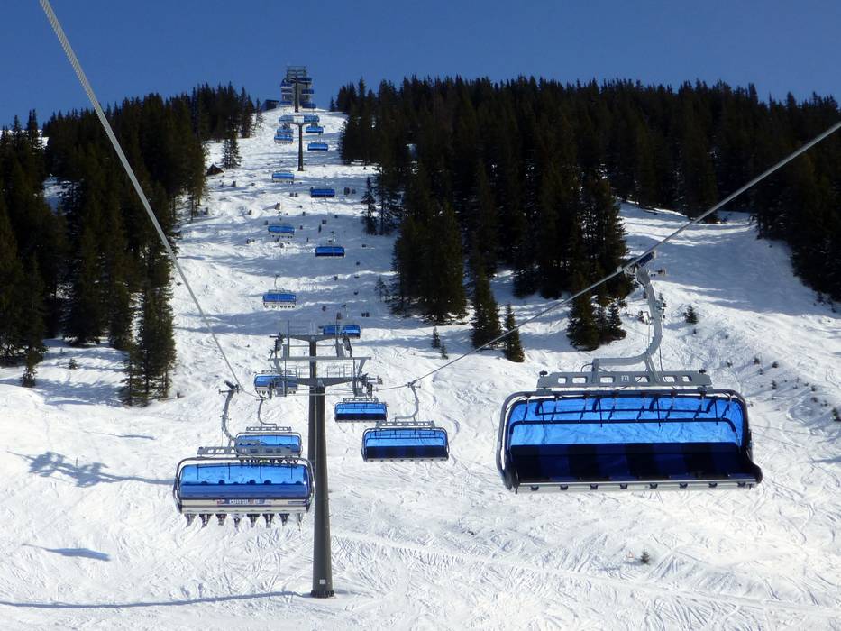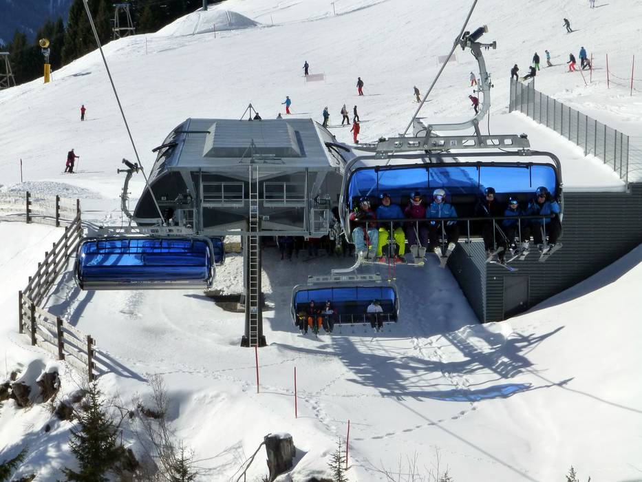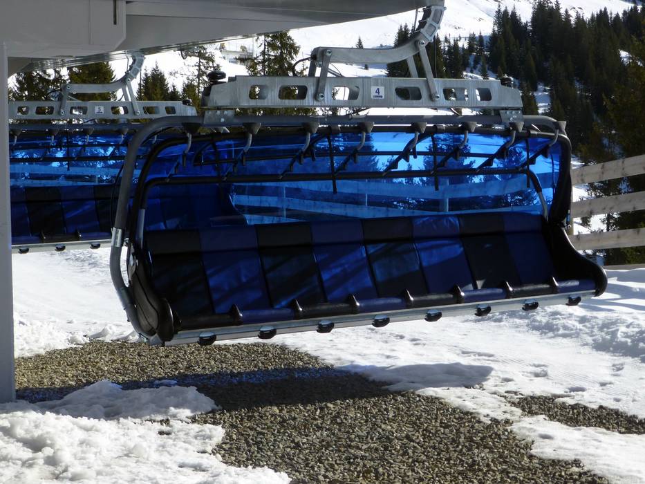 De 8-persoons stoeltjeslift Polten 8er is uitgerust met kinderbeveiliging, stoelverwarming en blauwe weerbeschermkappen.
