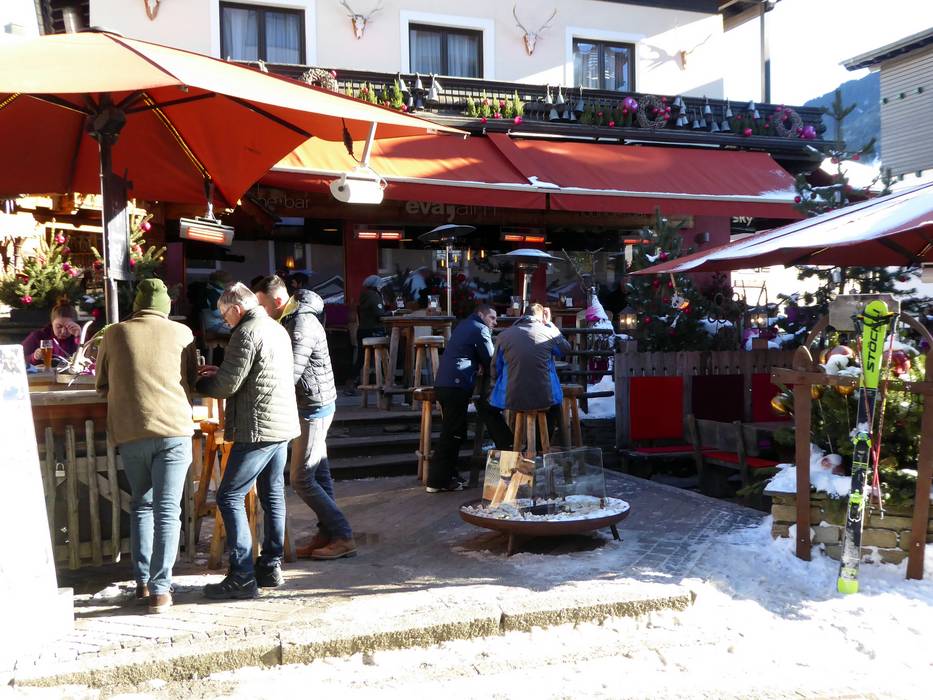 Onder het motto "Lässig. Chillig. Mittendrin." kun je in de EVA,Alm de skidag op een ontspannen manier afsluiten. Hier wordt gefeest zonder op de banken te staan. Je geniet van een lekker drankje en laat de dag nog eens de revue passeren. Je kunt rustig het kleurrijke gebeuren in de voetgangerszone van Saalbach bekijken.