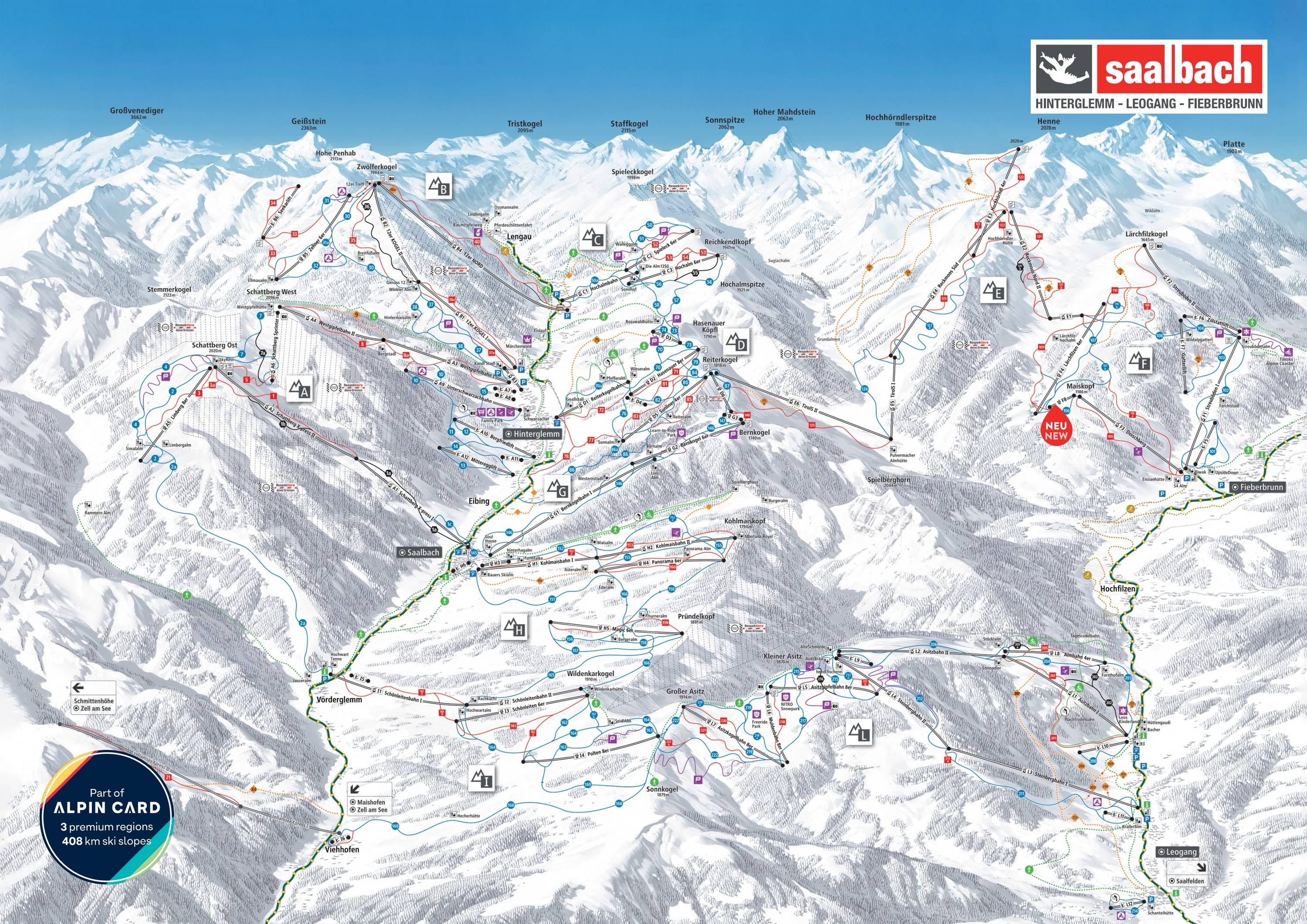 Het Skicircus Saalbach Hinterglemm Leogang Fieberbrunn heeft voor het seizoen 2019/20 een wereldwijd uniek pistesysteem gerealiseerd. Het systeem is uitstekend op het gebied van oriëntatie, veiligheid en uniformiteit. Het pisteplan geeft het skigebied zeer goed weer in tien alfanumerieke zones, waardoor je je uitstekend kunt oriënteren. Alle liften zijn aangeduid volgens de alfanumerieke zones en duidelijk herkenbaar met pictogrammen. Alle pistes zijn duidelijk van kleur voorzien en genummerd. Snowparks, race- en snelheidsafdalingen, funslopes, snow trails, verlichte pistes, rodelbanen en restaurants zijn duidelijk gemarkeerd. In de zogenaamde Ski Map, een klein extra pisteplan, worden bovendien verschillende routes door het wintersportgebied voorgesteld. Een gratis navigatie-app voor de gehele ALPIN CARD regio met visuele en audiogestuurde routebegeleiding in drie moeilijkheidsgraden (blauw, rood, zwart) naar alle liften, hutten en attracties maakt het aanbod compleet.