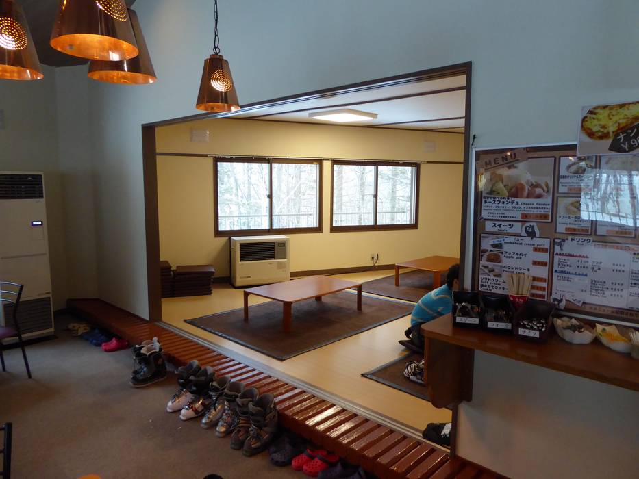 De Hana-Mori-Kuma Café Lodge is een typische Japanse hut met drankjes en eten. In een deel van de hut mag je alleen zonder skischoenen plaatsnemen. Naast Japanse lekkernijen wordt er ook raclette aangeboden.