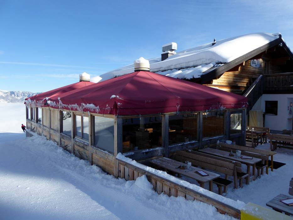 Het openluchtpaviljoen van de Almrausch Schirmbar ligt direct bij het bergstation van de Planai 6-persoons gondel aan de oostelijke afdaling piste nr. 3. Wisselende live-acts en danseressen zorgen voor een geweldige sfeer tijdens het Skihaserlfeest.